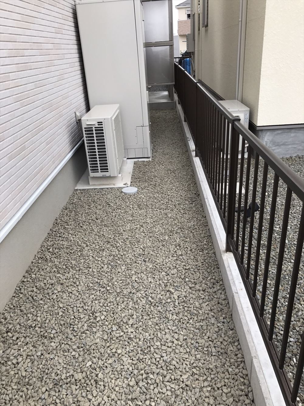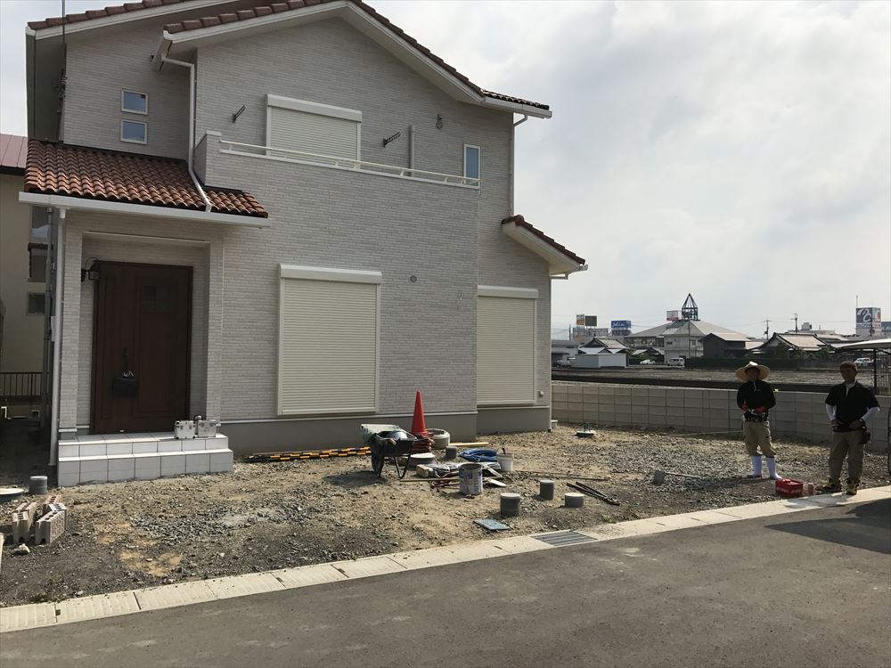 乱張り:オークルストーン 乱形 ブラジルイエロー 門柱前花壇:東洋工業 プリコロ プリチョコ カーポート横花壇:マツオ リブブロック 12-1LW