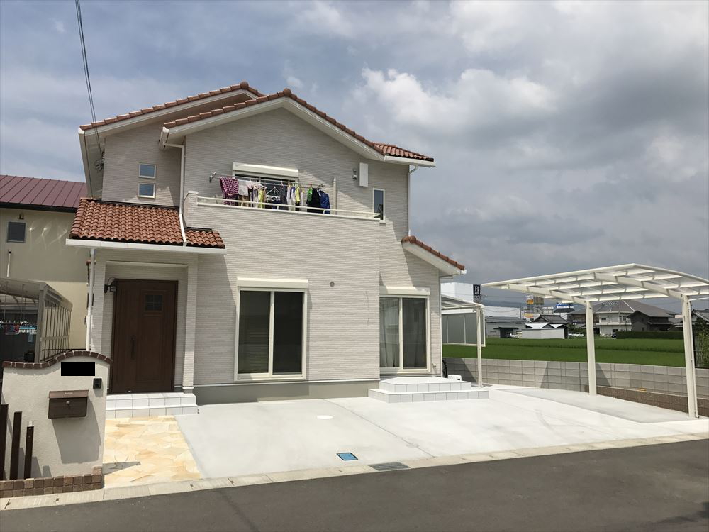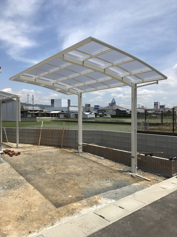 カーポート:YKKAP レイナポートグラン 51-27 本体色/ホワイト 屋根/トーメイマット テラス:YKKAP ヴェクター F型 柱標準タイプ 本体色/ホワイト 屋根/トーメイマット 前面パネル 1.5間 1段