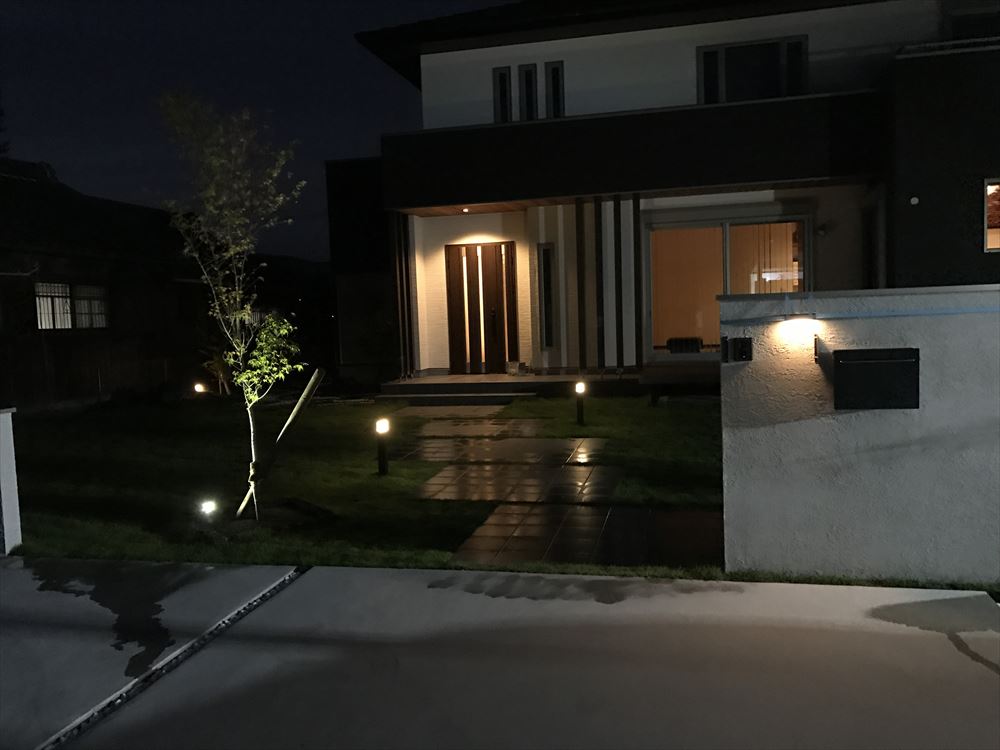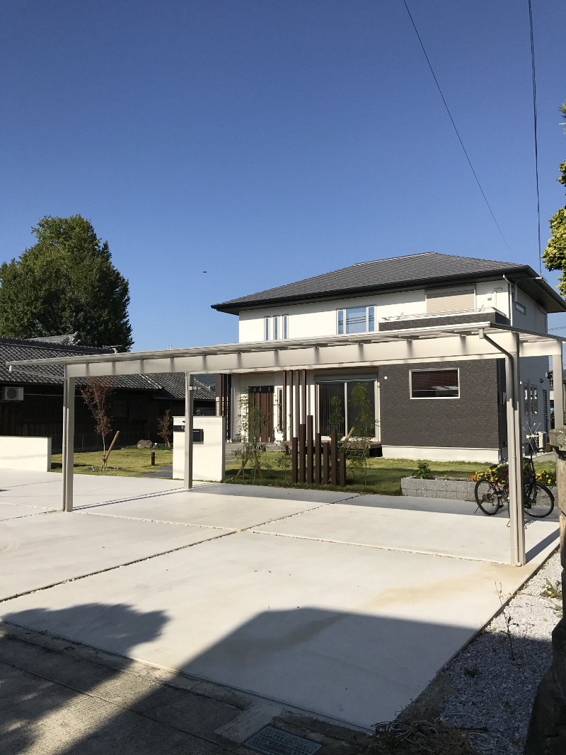 カーポート:エフルージュトリプル 基本57-79H 本体色/プラチナステン 屋根/トーメイマット(ポリカ) ウッドデッキ:YKKAP リウッドデッキ200 Sタイプ レッドブラウン色 +リウッドステップ5型 化粧ポール:タカショー エバーアート部材 スリットフェンス用 格子材 100角